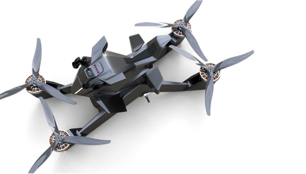 y cuatro hélices de fibra de carbono de 120 centímetros.