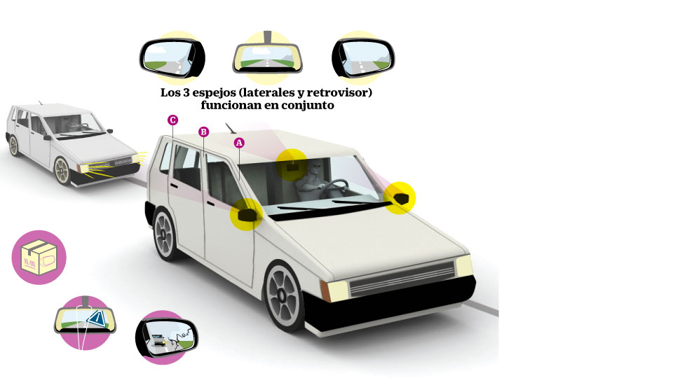 Los puntos ciegos se generan con los postes del marcodel parabrisas (A),los postes centrales (B) y los costados superiorestraseros (C)